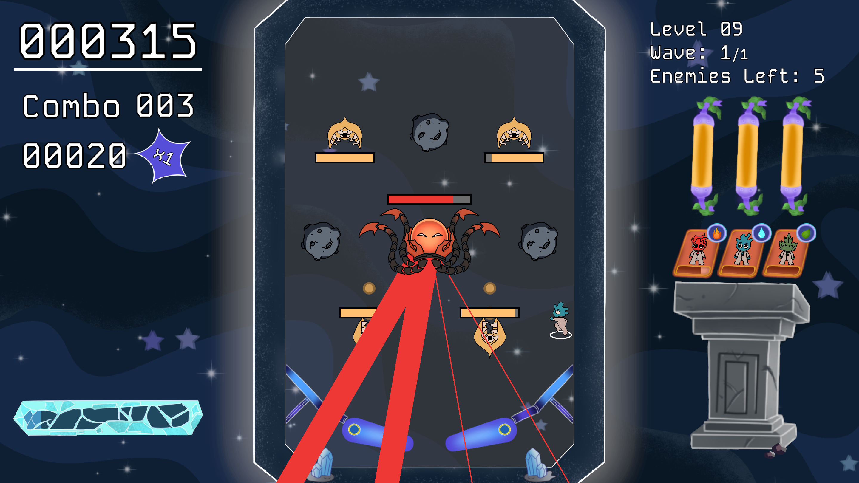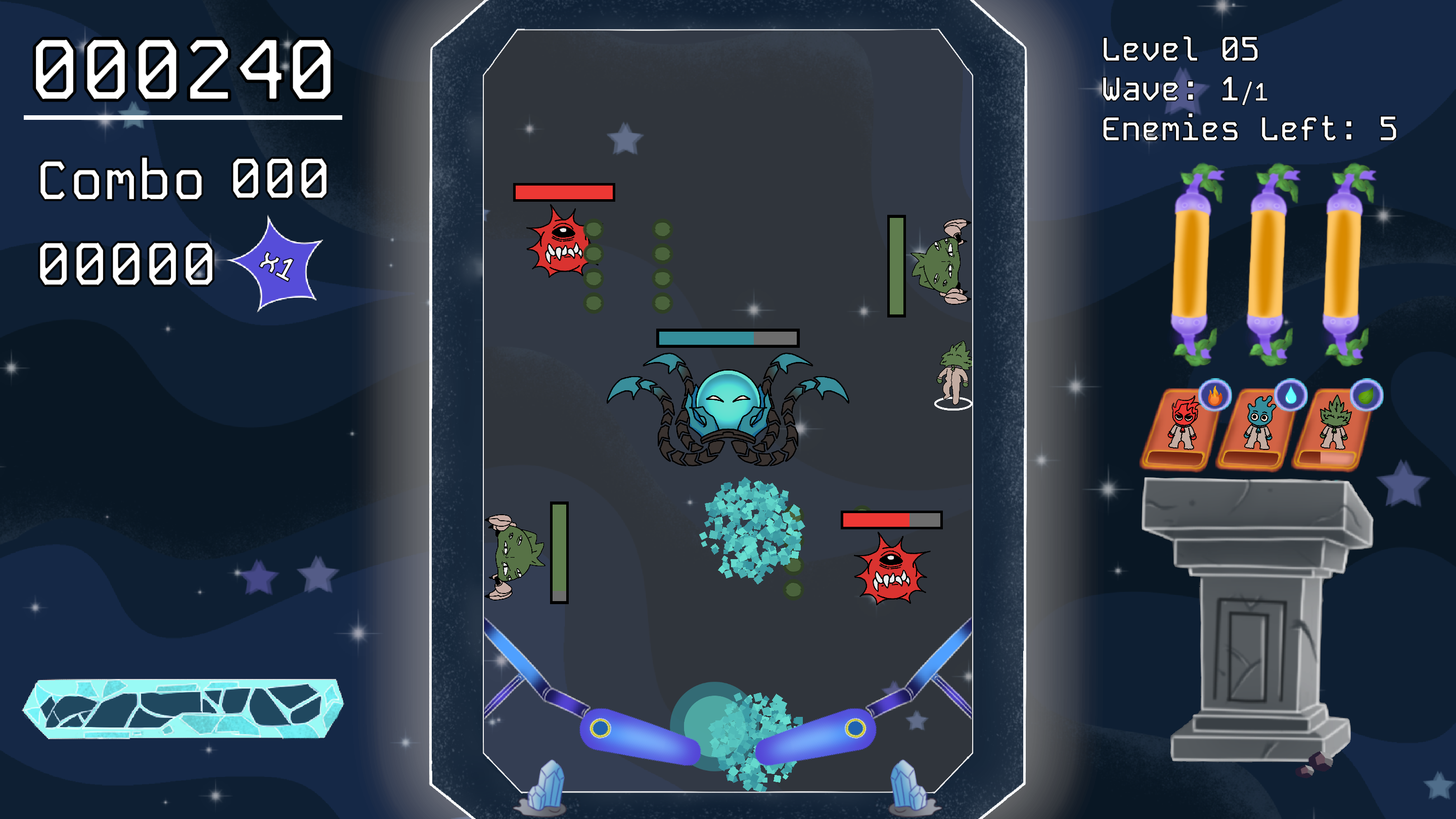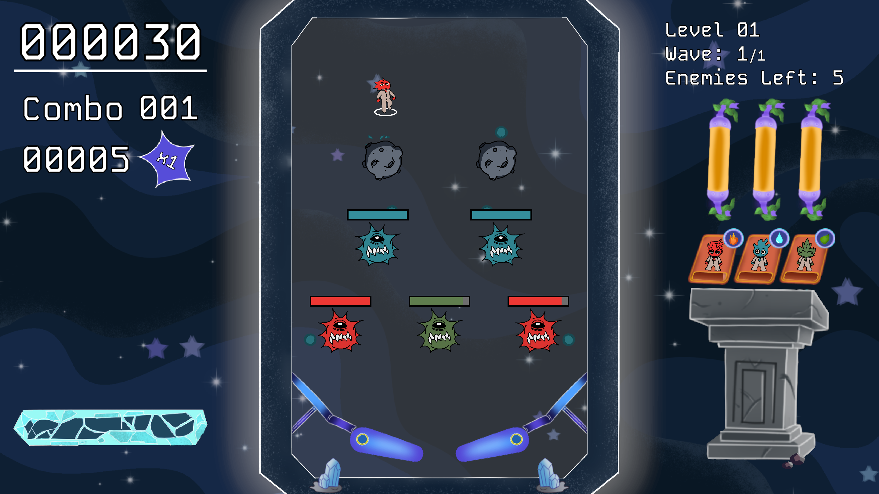 Game yang terinspirasi dari game pinball yang mengubah bola menjadi character dan menambahkan musuh di area board. Karakter akan dilempar dengan flipper layaknya game pinball. Jika karakter bersentuhan dengan musuh, nyawa musuh akan berkurang.